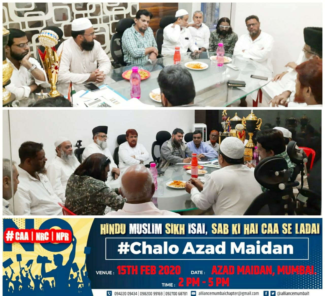 ۱۵ ؍ فروری کے عوامی اجتماع کی کامیابی کیلئے محاذ روزانہ میٹنگ کرکے اس کی تیاری کا جائزہ لے رہا ہے ۔ اسی سلسلے میں ایک میٹنگ بروز ہفتہ رابوڑی تھانے میں ہوئی ۔ میٹنگ میں آزاد میدان کی ریلی کی تیاریوں کا جائزہ لیا گیا ۔ میٹنگ میں طے کیا گیا کہ سی اے اے ، این پی آر اور این آر سی کیخلاف سبھی فرقوں میں بیداری لانے کیلئے کوشش کی جائے نیز آزاد میدان تک احتجاج میں شامل ہونے والے افراد کی سہولت کیلئے بسوں کا نظم بھی کیا جائے گا ۔