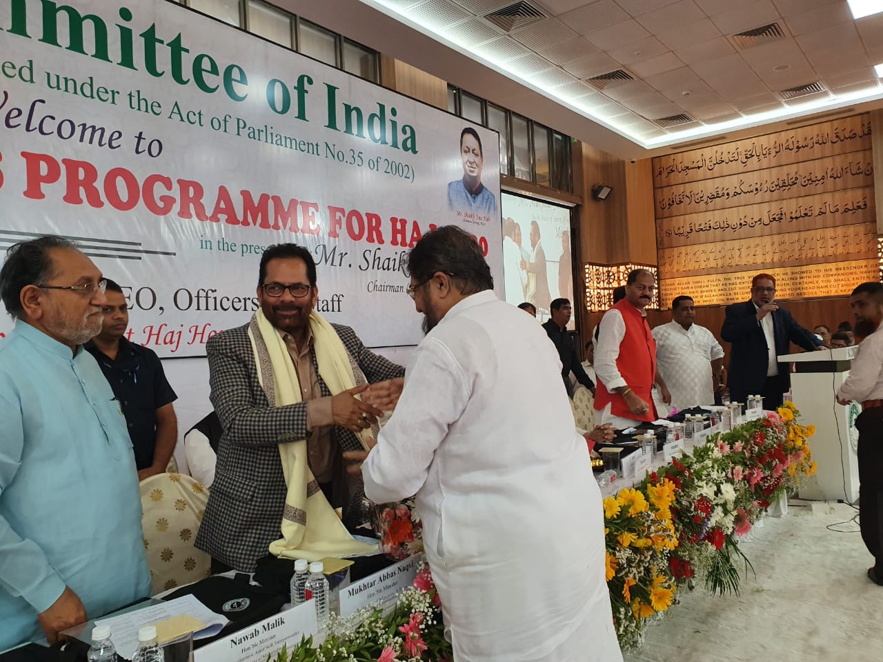 تصویرمیں الحاج بشیر موسی پٹیل اور مختار عباس نقوی خوش گوار موڈ میں مصافحہ کرتے ہوئے دیکھے جاسکتے ہیں جہاں رکن راجیہ سبھا حسین دلوائی بھی موجود ہیں ۔ الحاج بشیر موسی پٹیل نے بتایا کہ ڈاکٹر مقصود احمد خان نےحج کمیٹی آف انڈیا ، حج ہاوس کے سی ای اوبننے کے بعد کئی قابل قدر خدمات انجام دی ہیں ۔ انھوں نےحاجیوں کو در پیش کئی مسائل نہ صرف حل کئے ہیں بلکہ ان کی ہر ضرورت کے حصول کو آسان بنانے کی بھی کوشش کی ہیں ۔ ان کی سربراہی میں حج کمیٹی آف انڈیا ، حج ہاوس مسلسل ترقی کررہا ہے جس سے قوم و ملت کو فائدہ حاصل ہو رہا ہے ۔