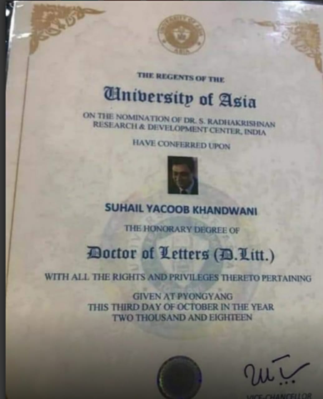 کھنڈوانی نے یونیورسٹی آف ایشیا سے یہ فرضی ڈگری حاصل کی ہے جس کا کوئی وجود ہی نہیں ہے جو 25 ہزار میں ڈاکٹر کی ڈگری تقسیم کرے ۔ جادھو نے کہا کہ وہ اس کیخلاف کارروائی کی مطالبہ کرتے ہیں کیونکہ کئی مزید اہم شخصیات بھی اس فرضی یونیورسٹی کے ڈاکٹر کی ڈگری کے گاہک ہیں جبکہ بھارتی تعلیمی ادارے اور تنظیمیں اور شعبہ صحت بیدار نہیں ہے ۔