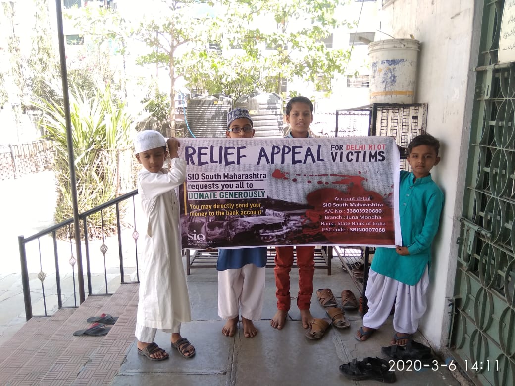 دہلی میں مسلم کش فسادات سے پریشان حال عوام کو راحت پہنچانے اور امدادی کام انجام دینے کے لئےطلباء تنظیم اسٹوڈنسں اسلامک آرگنائزیشن آف انڈیا(ایس آئی او) کی جانب سے ملکی سطح پر مالی امداد جمع کرنے کی مہم چلائی جارہی ہے ۔
