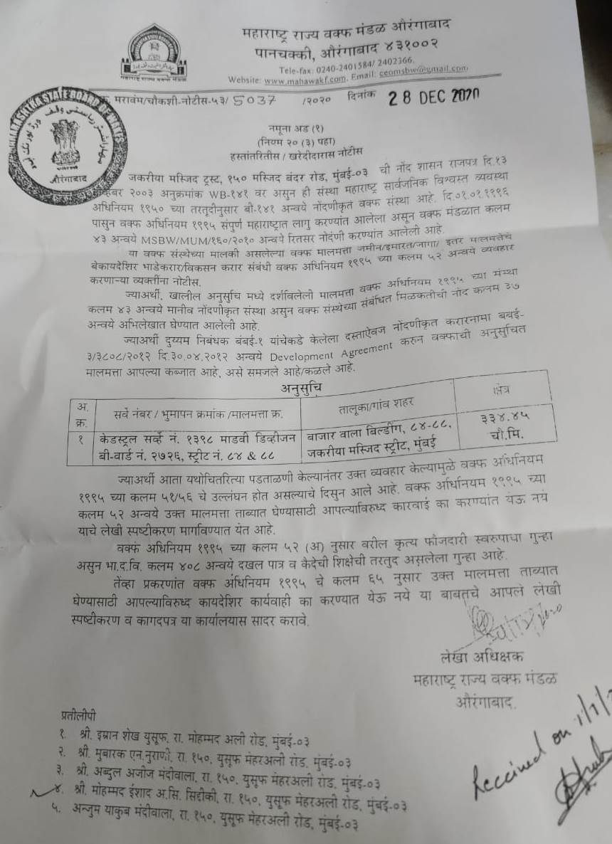 ممبئی : مہاراشٹر وقف بورڈ نے زکریا مسجد اسٹریٹ میں واقع بازار والا بلڈنگ کی از سر نو تعمیر کو لیکر نوٹس جاری کیا ہے ۔ نوٹس میں وقف بورڈ نے واضح کیا ہے کہ زکریا مسجد ٹرسٹ کی نگرانی میں بازار والابلڈنگ کو از سر نو تعمیر یعنی ریڈیولپمنٹ کیا جا رہا ہے ۔ یہ وقف کی ملکیت ہے ، اس لئے اس کے ریڈیولپمنٹ کیلئے جو خرید و فروخت ہوئی ہے وہ غیر قانونی ہے ، وقف نے زکریا مسجد ٹرسٹ کے ٹرسٹی ارشاد لکڑاوالا ، ایم ایس نینا ریلٹی کے مالک بلڈر آصف اسلم نرباں ، بی ایم سی کمشنر اور مہاڈا سمیت ١٢ لوگوں کو نوٹس جاری کر اس سودے بازی پر جواب طلب کیا گیا ہے ۔ وقف بورڈ نے اپنے نوٹس میں یہ بھی سوال کیا ہے کہ اس غیر قانونی سودے بازی کیلئے کیوں نہ انکے خلاف کارروائی کی جائے جنہوں نے وقف کی ملکیت کا غیر قانونی سودا کیا ہے ۔