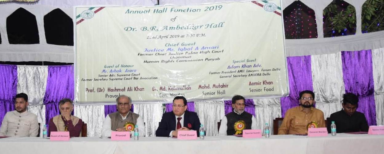 علی گڑھ : علی گڑھ مسلم یونیورسٹی (اے ایم یو) کے بی آر امبیڈکر ہال میں پرووسٹ پروفیسر حشمت علی خاں کی قیادت میں سالانہ ہال تقریبات2019 کا انعقاد عمل میں آیا ۔ تقریب کے مہمانِ خصوصی پٹنہ ہائی کورٹ کے سابق جج جسٹس اقبال انصاری نے اپنے خطاب میں قانون کی اہمیت اور اس کے صحیح استعمال پرتفصیل سے روشنی ڈالی ۔ اعزازی مہمان سپریم کورٹ کے سینئر وکیل اشوک ارورا نے اے ایم یو سے اپنے25سالہ رشتے کا ذکر کرتے ہوئے کہا کہ وہ یہاں کی روایات اور تہذیب و ثقافت سے کافی متاثر ہیں ۔