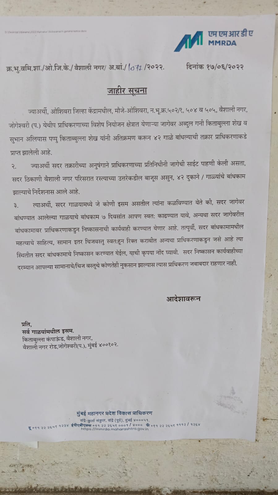 ممبئی : ممبئی کے جوگیشوری علاقے میں ایم ایم آر ڈی اے نے بیک وقت 42 دکانوں اور گالوں کو نوٹس جاری کر کے ان سے غیر قانونی قبضے سے ہٹنے کے لیے کہا گیا ہے ۔ نوٹس میں ایم ایم آر ڈے اے نے کہا کہ اس جگہ کا دورہ کیا گیا تو معلوم ہوا کہ یہاں 42 دکانیں مکمل طور پر غیر قانونی ہیں اور یہاں ایک شادی ہال بھی ہے جو غیر قانونی طریقے سے بنایا گیا تھا۔