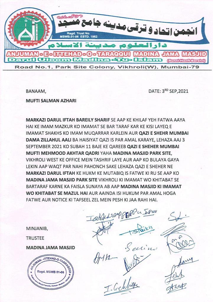 مسجد کمیٹی ٹرسٹ کا الزام ہے کہ مفتی سلمان نے اس مسجد میں امامت کرتے ہوئے ایک ٹرسٹ قائم کیا جو کہ غیر قانونی ہے ۔ اس کے علاوہ بھی ان پر متعدد الزامات عائد کئے جارہے ہیں جن میں تعویز گنڈہ کرنا اور خواتین کے ذریعہ خود کو سجدہ کروانا شامل ہے ۔بہر حال الزام اور جوابی الزام کا سلسلہ جاری ہے ۔ لیکن قانونی طور سے امامت کے فرائض سے انہیں سبکدوش کردیا گیا ہے ۔ انہیں نوٹس جاری کیا گیا تھا کہ میٹنگ میں شامل ہوں مگر ان کی عدم شمولیت کے بعد قاضی شہر مفتی محمود احمد قادری کی موجودگی میں ان کو مدینہ مسجد وکرولی پارک سائٹ کی امامت سے بے دخل کیا گیا ۔