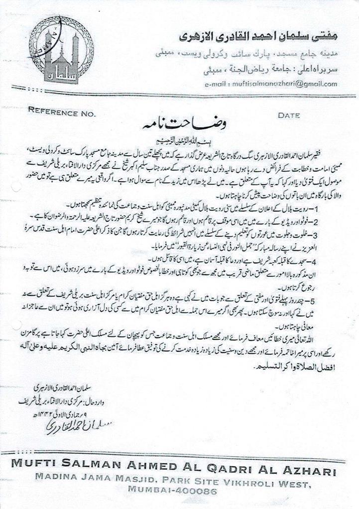 موصول جانکاری کے مطابق رضوی دارلافتا بریلی اور اشرفیہ مبارکپور سے ویڈیو بنانے اور مسجد کے منبر و محراب کو اس کیلئے استعمال کرنے سے متعلق سوالات پوچھے گئے تھے ۔ بریلی سے فتویٰ آیا کہ امام مذکور کو توبہ کیلئے کہا جائے اگر وہ توبہ کرلیں تو امامت سے ہٹانے کی ضرورت نہیں جبکہ اشرفیہ مبارکپور سے آنے والے فتویٰ میں ایسا کچھ نہیں ہے ۔