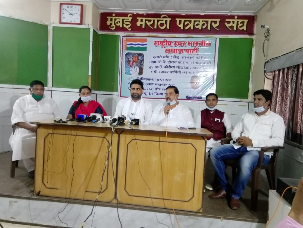 ممبئی : راشٹریہ اتر بھارتی سماج پارٹی کی جانب سے مراٹھی پترکار سنگھ میں پریس کانفرنس کا انعقاد کیا گیا جس میں پارٹی کے قومی صدر نے کورونا وبا کے دوران مریضوں کیلئے خدمات انجام دینے والے ہسپتال عملہ کو مرکزی حکومت سے اعلیٰ قومی ایوارڈ دینے کا مطالبہ کیا ۔