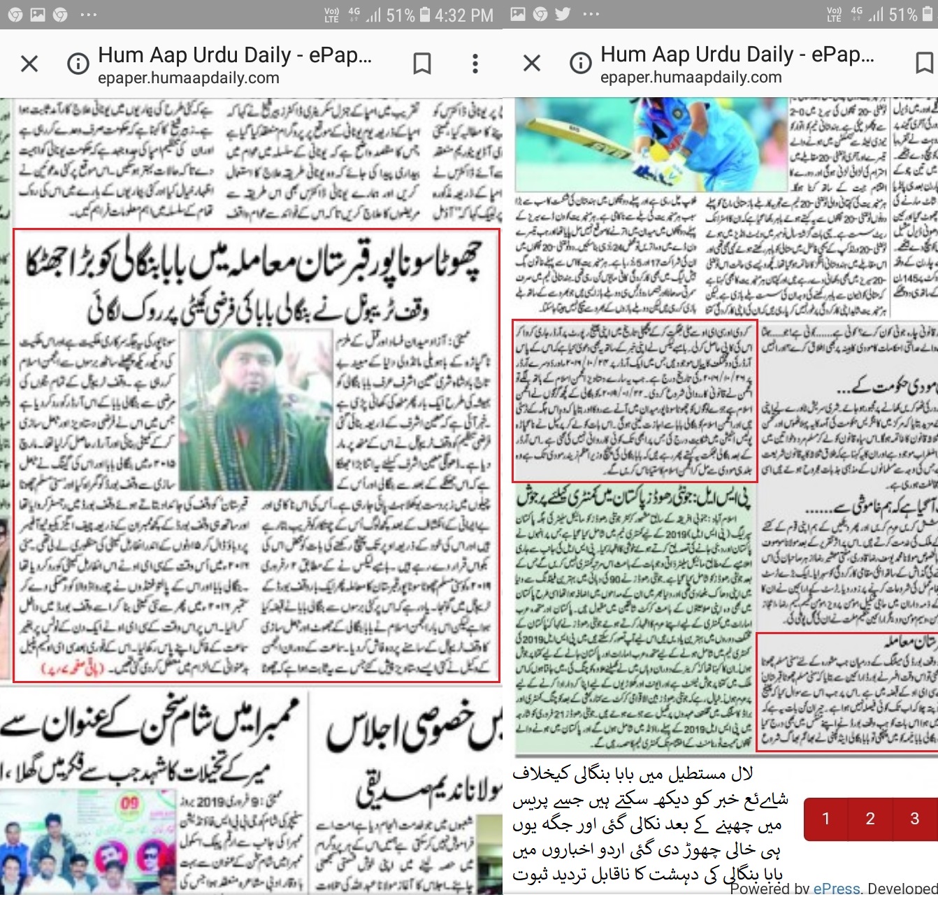 ممبئی : بابا بنگالی شری معین اشرف کی اردو اخباروں پر کتنی دہشت ہے اس کا اندازہ ۱ٓج ۱۱؍ فروری کے نوزائیدہ اخبار روزنامہ ’ہم آپ ‘ کے صفحہ آٹھ کو دیکھئے وہاں آپ کو بیچ کا ایک بلاک خالی ملے گا جس میں آخر میں لکھا ہے بقیہ خبر صفحہ سات پر ،اب صفحہ سات دیکھئے تو وہاں بھی دو بلاک خالی ملے گا ۔یہ دیکھ کر اخبار کے قاری حیرت زدہ رہ گئے کہ اخبار کی جگہ خالی کیوں ہے ؟ قارئین کوکیا پتہ کہ اس خالی جگہ پر شری معین اشرف عرف بابا بنگالی کیخلاف وہ خبر لگانے کی اس کے ایڈیٹر جلال الدین نے جرات کی لیکن یہ جرات چند گھنٹہ بھی قائم نہ رہ سکی اور رات میں پریس میں فون کرکے وہ خبر ہٹواکر وہ خالی چھوڑ دی گئی ۔بابا بنگالی کی یہ خبر اس کی مہاراشٹر وقف بورڈ ٹریبونل میں اس کی ہزیمت کی خبر تھی ۔جس میں اس کے فرضی ٹرسٹ کو کالعدم قرار دیا گیا تھا ۔وقف بورڈ نے بنگالی بابا کو اپنی بات رکھنے کیلئے موقعہ بھی دیا لیکن اپنی جعل سازی کی وجہ سے شاید بابا بنگالی وقف بورڈ ٹریبونل کی تاریخ میں اپنا موقف رکھنے کیلئے حا ضر نہیں ہوا ۔