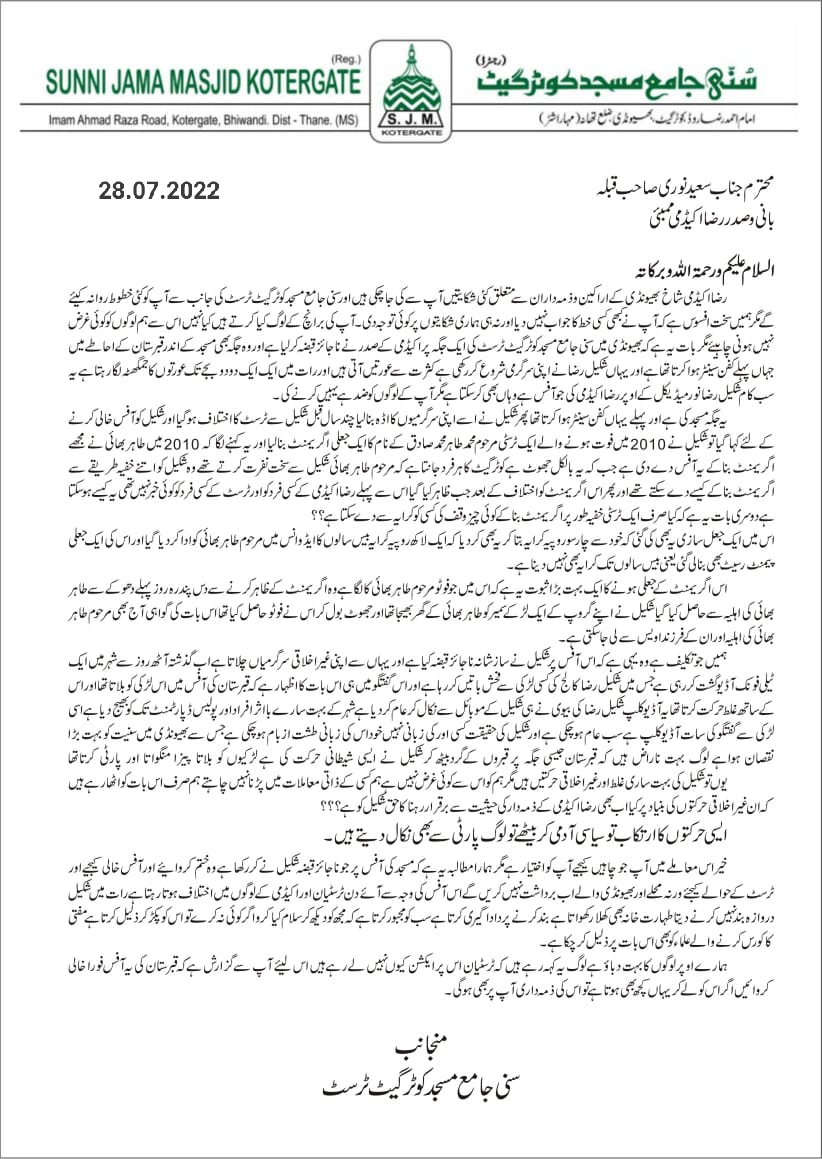 خط میں جعل سازی اور جھوٹ سے ایگریمنٹ بنواکر رضا اکیڈمی کیلئے آفس پر ناجائز قبضہ کی بات بھی کہی گئی ہے اور شکیل رضا کو اس کی غیر اخلاقی حرکتوں کی وجہ سے رضا اکیڈمی سے برخواست کرنے نیز آفس پر ناجائز قبضہ ختم کرنے کیلئے کہا گیا ہے ، بصورت دیگر یہ دھمکی دی گئی ہے کہ مسجد کمیٹی اور محلہ کے افراد مل کر زبردستی آفس خالی کروالیں گے ۔ اب دیکھنا یہ ہوگا کہ مسلکی منافرت پھیلانے والی تنظیم ایسے عاشق مزاج اور بدعنوان شخص پر کب تک کارروائی کرتی ہے ۔