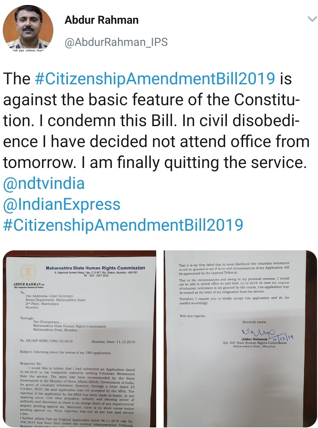 ممبئی : منظر عام پر آنے اور میڈیا میں مشتہر ہونے کے لئے نیز بہتی گنگا میں ہاتھ دھونے کا تازہ معاملہ سامنے آیا ہے ۔ ۱۹۹۷ بیچ کے آئی پی ایس افسر عبدالرحمن نے شہریت ترمیم بل پاس ہونے پر اپنا احتجاج درج کراتے ہوئے حکومت کو استعفیٰ پیش کردیا ہے ۔ اس کیلئے انہوں نے اپنے ٹوئٹر اکائونٹ کا بھی سہارا لیا جس سے انہیں میڈیا میں ہاتھوں ہاتھ لیا گیا اور سرخیوں میں آگئے ۔ حالانکہ اس سے قبل رضاکارانہ سبکدوشی کی درخواست دے چکے تھے لیکن ان کی یہ درخواست کسی وجہ سے قبول نہیں کی گئی تھی ۔ تعجب کی بات یہ ہے کہ منظر عام پر آنے اور قوم کے ہمدرد کی حیثیت سے پہچانے جانے کی نیت سے انہوں نے ٹوئٹر کا سہارا لینے والے آئی پی ایس افسر عبد الرحمن کو کئی صحافیوں نے مسلمانوں کے لئے مگرمچھ کے آنسو بہانے اور ناٹک کرنے والے افسر کو کو فون کیا لیکن وہ دن بھر صحافیوں سے نظریں بچاتے ہوئے نظر آئے ۔